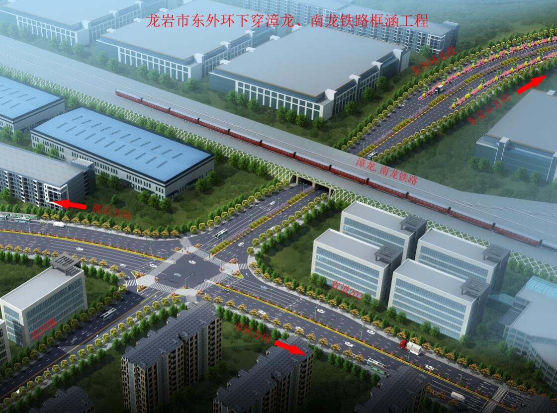 東外環下穿漳龍、南龍鐵路框涵工程頂進框架總寬41.75米,長43米,框架孔跨布置為:6m(非機動車道)+12m(機動車道)+12m(機動車道)+6m(非機動車道);機動車道框架采用C40鋼筋混凝土,凈空≥4.5m,非機動車道框架C40鋼筋混凝土,凈空≥2.5m,項目投資約8000萬元。