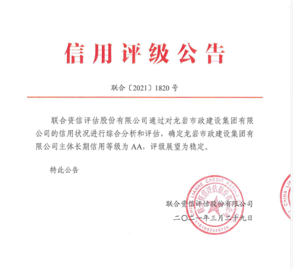 2021年3月29日,經(jīng)國內權威評級機構聯(lián)合資信評估有限公司評級專家集體分析、研究、決議,一致通過給予龍巖市政建設集團有限公司AA主體信用評級,評級展望穩(wěn)定。