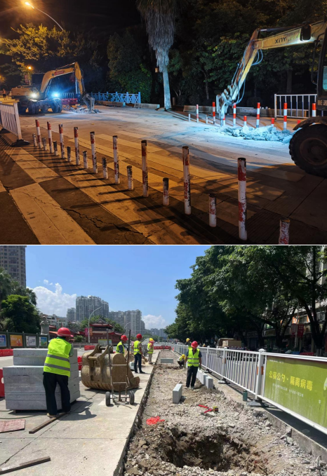 近日,中心城區(qū)南城街道小溪路口機器轟鳴,工人們破除路面、開挖路基、遷改管線等一片繁忙的施工景象。